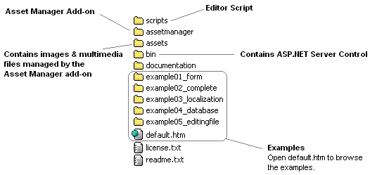 Open file default.htm to browse the examples and the documentation. According to several examples, it is recomended that you copy all files into a virtual directory named Editor in your web server, so that you can access the examples by opening:
